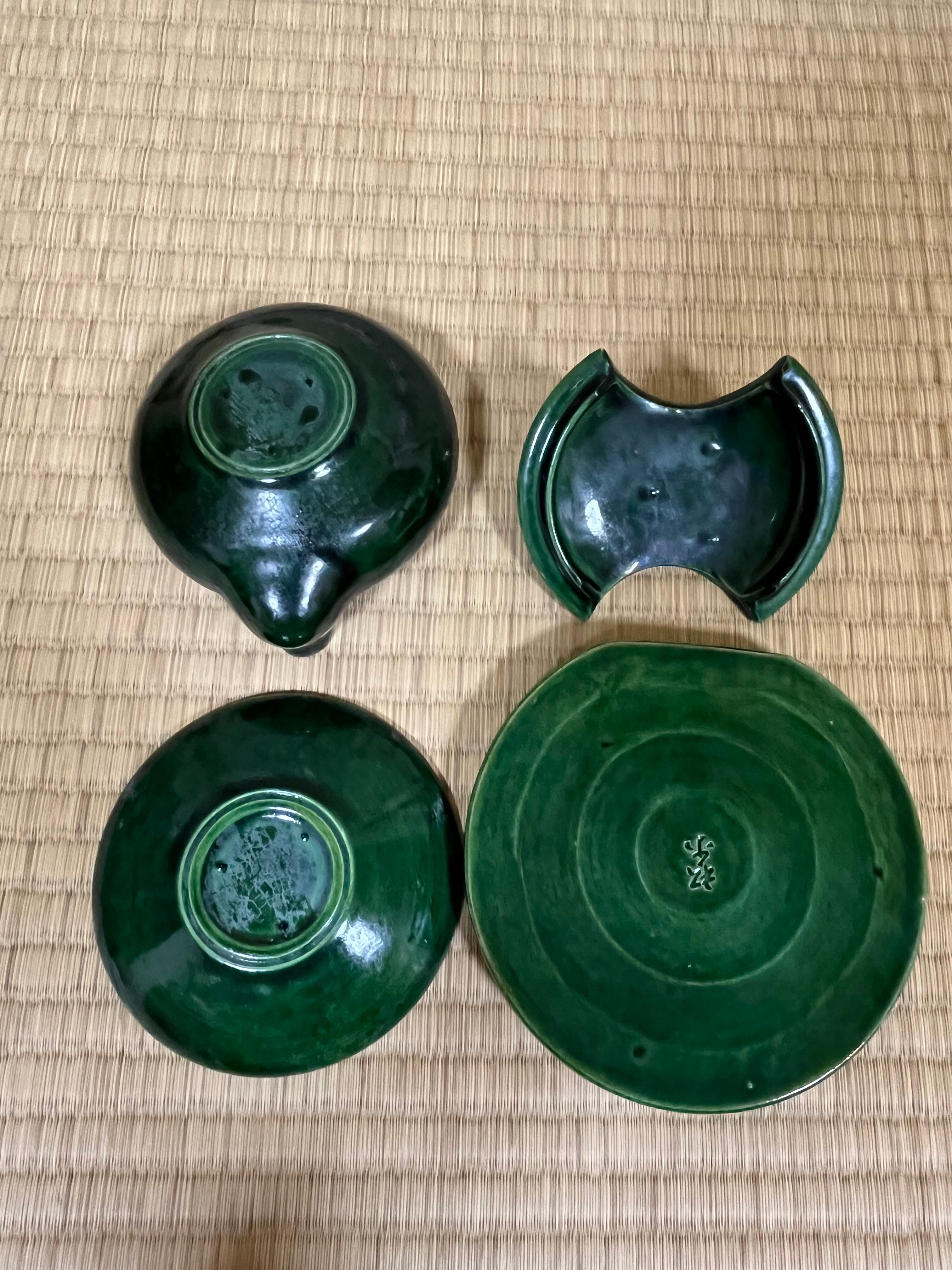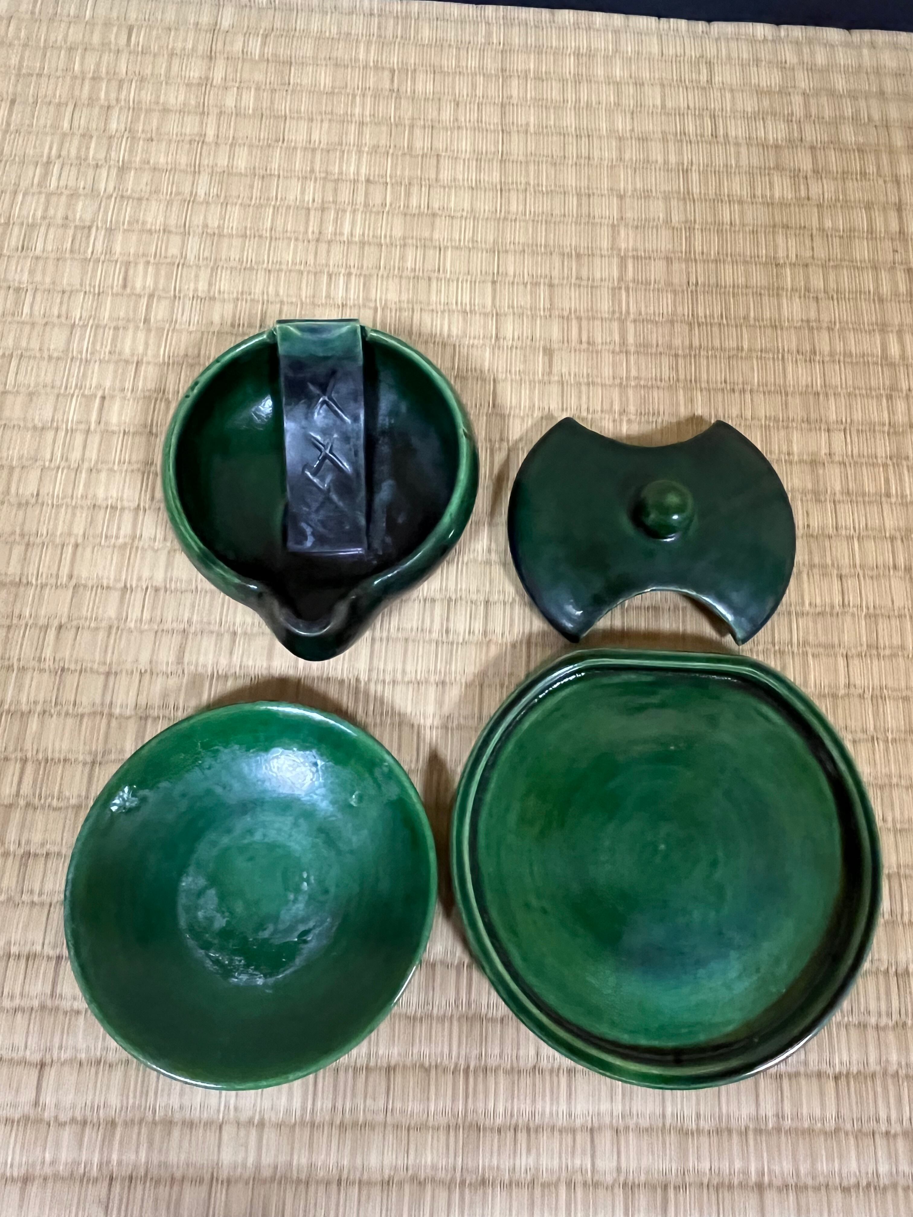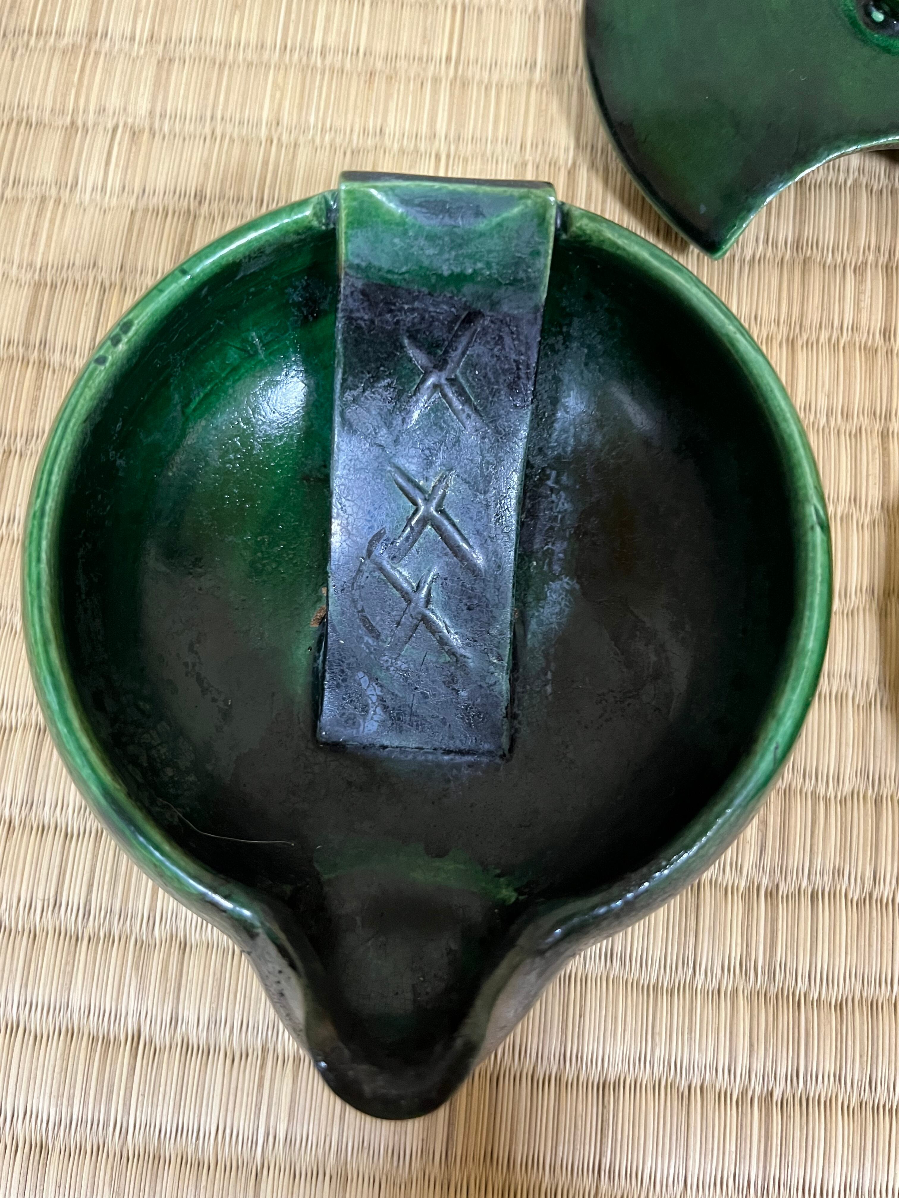 雀瓦 下皿径13.2 受皿径10.7 雀瓦の口を含めた径12 蓋の摘みまでの高さ7.5 青楽(緑)松楽窯